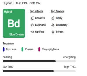 Blue Magoo is a sativa-dominant hybrid marijuana strain made by crossing Blueberry with Haze. This strain produces a balanced high, along with effects such as cerebral stimulation and full-body relaxation. Blue Dream can be more than 20% THC but has a low CBD percentage, making this potent strain a fan favorite of both novice and veteran cannabis consumers. In terms of flavor, Blue Dream is reported to smell and taste like sweet berries. Medical marijuana patients often use Blue Dream to treat symptoms of stress, anxiety and depression. Blue Dream originated in California and has since achieved legendary status among West Coast strains and has quickly become one of the most-searched-for strains.