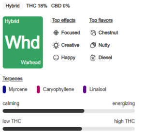 Warhead, also known as Warheads,, is a hybrid weed strain. Reviewers on Leafly say this strain makes them feel focused, creative, and happy. Warhead has 18% THC. The dominant terpene in this strain is myrcene. If you’ve smoked, dabbed, or otherwise enjoyed this strain, Warhead, before let us know! Leave a review.