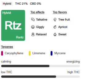 PRESIDENTIAL RUNTZ, also known as “Runtz OG,” is a rare type of hybrid marijuana strain. Runtz is made by Cookies Fam by crossing Zkittlez with Gelato and it is loved for its incredibly fruity flavor profile that smells just like a bag of the sugary candy we all know and love.