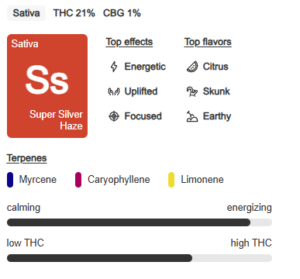 Super Silver Haze is a sativa marijuana strain bred by Green House Seeds. It was the first prize winner at the High Times Cannabis Cup in 1997, 1998, and 1999. Super Silver Haze is made by crossing Skunk, Northern Lights, and Haze creates a beautiful, sticky strain that boasts an energetic, long-lasting body high. The uplifting effects are a great for high stress levels or when suffering from a lack of appetite or nausea.